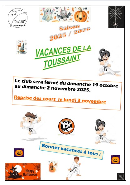 Le Karate Club de Charenton sera fermé du dimanche 19 octobre au dimanche 2 novembre inclus à l’occasion des vacances de la Toussaint.